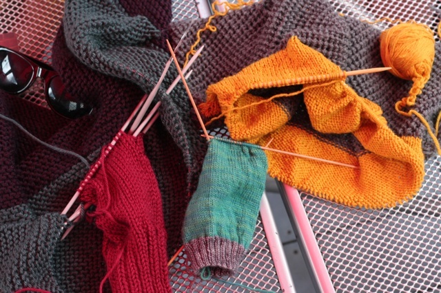 The knitting: Emma’s socks (red), Allegra’s blanket, Katie’s top, and my sock .(Jeanne’s yarn bombing is missing because she was worried about missing her train, and I didn’t think to get one until we were all leaving).