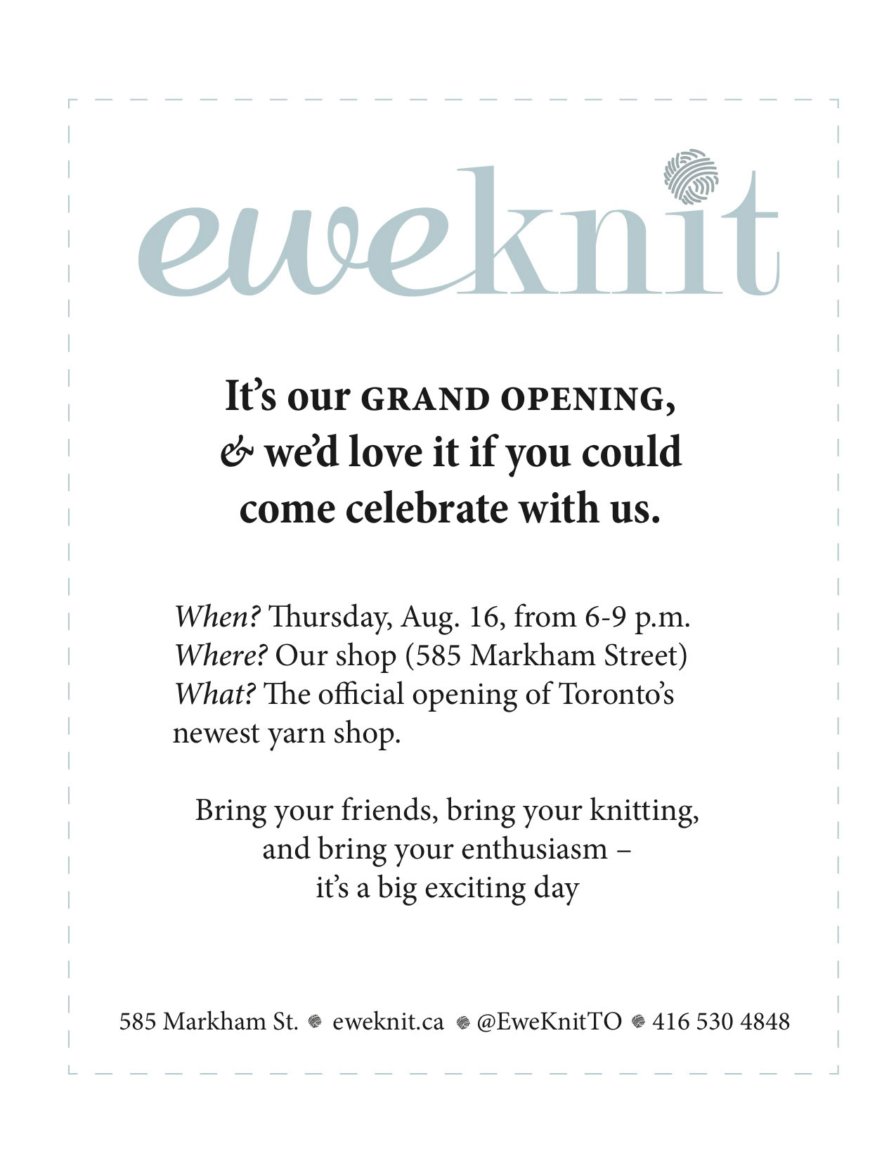 So, what does any of this matter to you (besides, hopefully, acting as an explanation for my erratic blogging)? Well, first of all, you’re all invited to the shop’s grand opening, which is this week! If you’re in Toronto, please drop in – check out the yarn, have a glass of wine, and come say hi (the proper invite is below). Secondly, I would like to assure you that I am still knitting – knitting like crazy, even – and that this blog will return to its usual assortment of posts after this crazy week is over.