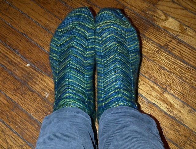 Hopefully the lack of photos in this post is self-explanatory. My BlackBerry camera is woefully inadequate, but I did snap this photo of my finished Spruce Jaywalkers. I will hopefully be getting a new camera this week (I’m thinking of the Canon 60D – what do you think?), so I will have a full post with photos and details when that happens. In the meantime, here you go: