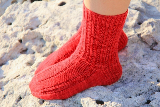 I knit these socks over two weeks, but actual knitting time was only about four days, so these would make an excellent last-minute gift. My mum requested that the socks be a little taller than the ones I knit for myself, so I knit the legs to 7 inches. She also has slightly longer feet than I do. Those two factors meant I needed just a bit more than 100g to knit these, but you could easily make them from one 100g skein. I now have 82g of red yarn leftover, but I might just whip that up into another Puerperium Cardigan (our friends had a baby girl last night!), so I’m not annoyed in the least that I needed that little bit of extra.