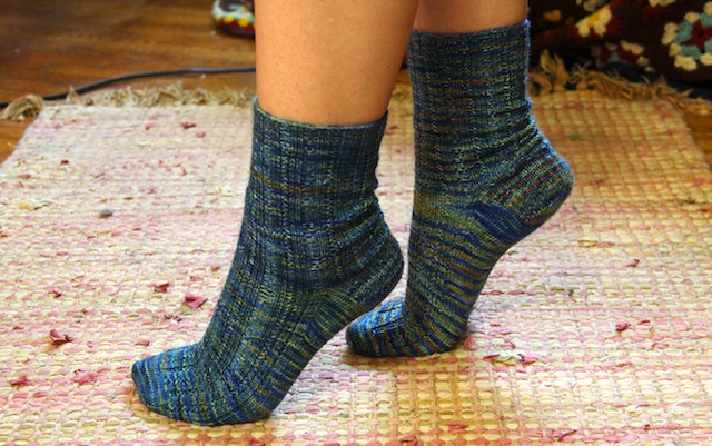 Mods: None, really. I forgot to knit a purl row after the ribbing, so I left it off the second sock too. The only other tweak I made was when dividing for the heel I arranged my stitches so the instep would be symmetrical, with one purl stitch on each side. Otherwise I just knit as the pattern directed me to. Ravelled here.