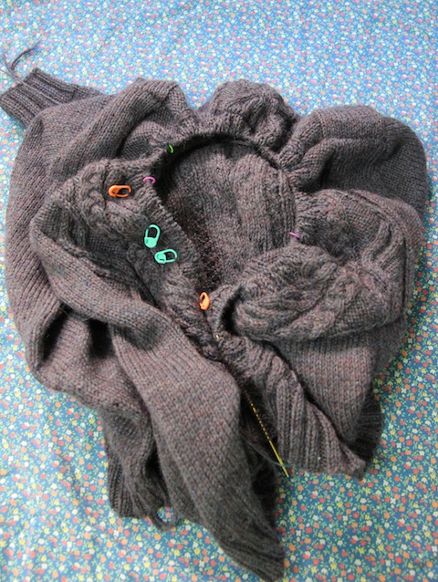 It’s not so bad, really. I’m four rows into the button band, which means I’m one row away from putting in the button holes, and since I’ve already more or less mapped out where they’re going to go, that’s a snap. And that means I’m only two rows away from starting the short-row shawl collar, and once that’s done I’m only a few rows from binding off, and then it’s just weaving in ends and I’m done. Practically nothing! Except my sister is coming to visit this weekend, and the weather looks good, so we probably won’t sit around the house talking while I knit like a maniac. But by the next week? Yeah, by then I should have a finished sweater to show you.