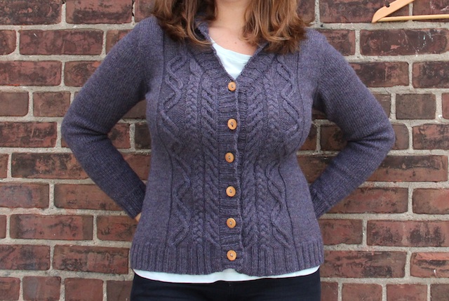 This is only my second finished sweater, and my first with seams and set-in sleeves, and I was a little nervous. I did a lot of holding pieces up to my body and trying to determine how they would look at the end (which is pretty much a waste of time). Once I had it all seamed, I tried it on and was pretty glad it fit, although the fit was off since it didn’t have a collar or button bands, and thank goodness those worked out the way I thought they would.