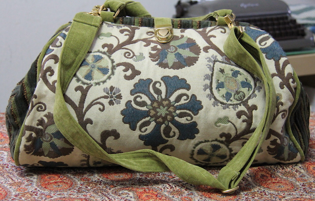This was a gift from Claudia. It's an Offhand Designs Scottie bag, and it is gorgeous. It was carry-on when I went to Switzerland, and it fits way more than you'd think (right now its being filled up with an afghan, if that helps for scale).