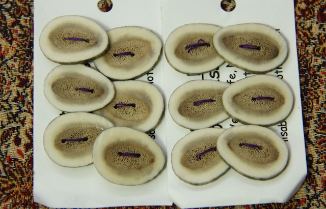 My sister Jenny is doing most of her masters research in Yellowknife and farther north in the Northwest Territories. These are buttons made of caribou antler that she bought at an art gallery in Yellowknife. I clearly need to knit a classic white-cabled Aran cardigan or something to go with them, don’t you think? They’re 1-inch wide at their widest point.
