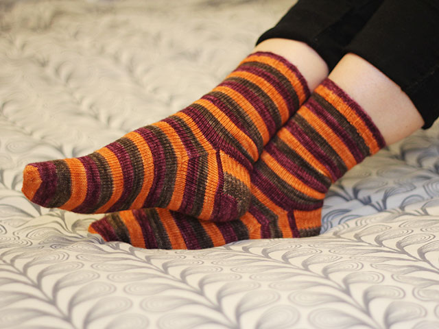 These are just my basic 68-stitch, top-down, tight-gauge (9 sts = 1 inch) socks, with 2×2 ribbing at the top and a slip-stitch heel. It’s a formula I use a lot, but in the last six months or so I’ve nailed down the fit of the foot to pretty much perfection, resulting in socks that fit so well I forget I’m wearing them (even at the end of a long day of walking there’s no sagging or movement).