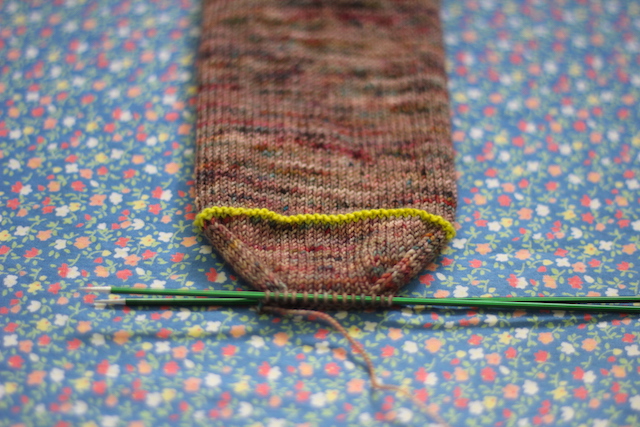 My current in-between socks are these very fun stripes. These were kind of supposed to be my Christmas socks, but I think the colours work year-round. (Yarn is the fantastic Nomadic Yarns Twisty Sock in Grinchmas.)