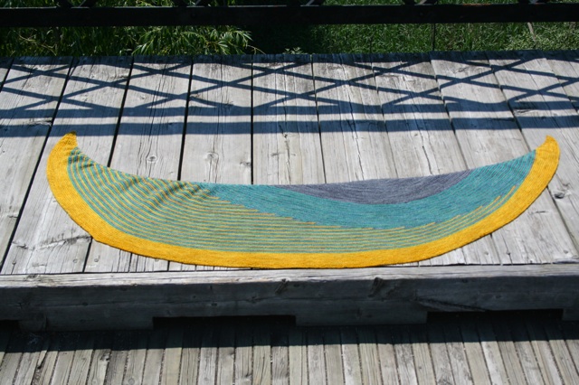 I have to say, though, that I am surprised by how much I like it. I was really worried there for a while. The thing is, when you start with dark colours, you get used to how that palette looks. I like the grey, I like the green, and together, they played of each other nicely. Then, when I got to the short rows and introduced the yellow, I felt like everything was suddenly off. Somehow, the nice greyish tones in the yellow disappeared, the subtly colour changes in the green were gone, and what I was left with was garish and, I thought, a little too tropical for my wardrobe. I was seriously afraid that after hours and hours and hours of knitting, I was never going to wear the thing. I couldn’t figure out how I’d gone so wrong – I mean, the colours had looked so nice all stacked up.