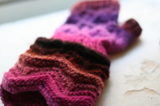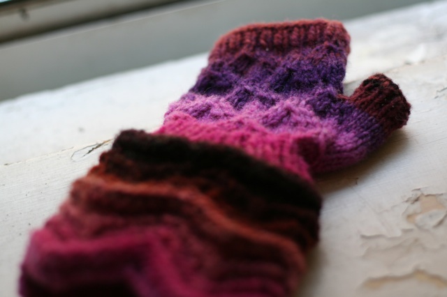 I modified the pattern a little (you can see all the details here on Ravelry), but really only for length, since I wanted a longer cuff and I also have long hands (and, lets face it, probably knit these at a tighter gauge than written, despite going up a needle size). I love how well this colour goes with my array of navy blue jackets, and also that the pattern is interesting and pretty without being too loud/likely to snag on things. I’m also really impressed by how well the yarn is holding up. I thought the alpaca might cause pilling or fuzzing (you should see the state of my Hodgepodge mittens, which are very warm, but also absurdly fuzzy), but I haven’t had any problems at all, which makes me really want to knit something larger with Acadia. I have two more skeins in this colourway, so I was thinking of knitting a matching cowl or something — what to do you think?