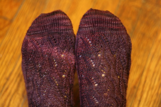 The pattern is easy, but not so mindless as to be numbing, and the yarn is fun and nice to knit with. I was an inch or so above dividing for the heel when I picked these up, and now I’m into the gussets, so it probably won’t be long before this is a completed pair, which I’m quite excited about. I have another skein of this Fleece Artist BFL Sock already wound and destined to be a pair of plain socks once these one are off the needles – truly, I love this yarn.