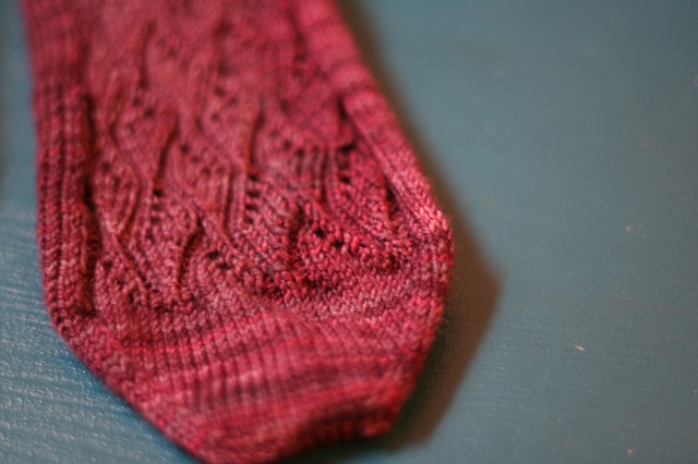 First, Christmas socks. I actually wanted to get these started a month ago (I swatched for them in August, for heaven’s sakes), but there always seemed to be something else on the needles. Anyway, on Monday night, when I was feeling a little better, I cast on the cuff for Cookie A.’s Daphne sock pattern. I fell in love with these socks when she first released the pattern, and knew it would be perfect for my sister, who always looks longingly at my handknit socks, and especially at the lace ones.