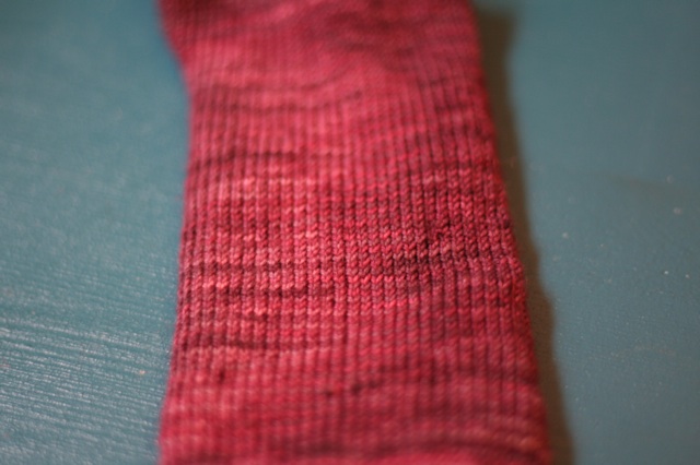 I’m knitting these in indigodragonfly’s Merino Silk 4-Ply Sock, a 50-50 silk merino blend that is very soft (and a little slippery) and perfect for the pattern. Although this is a fingering weight and the pattern calls for sport, it’s working out just fine. The colour is not quite as bubblegum as Cookie A.’s, but it’s certainly feminine, which you’d expect from a colourway called Don’t You Have an Elsewhere to Be? (Cordelia).