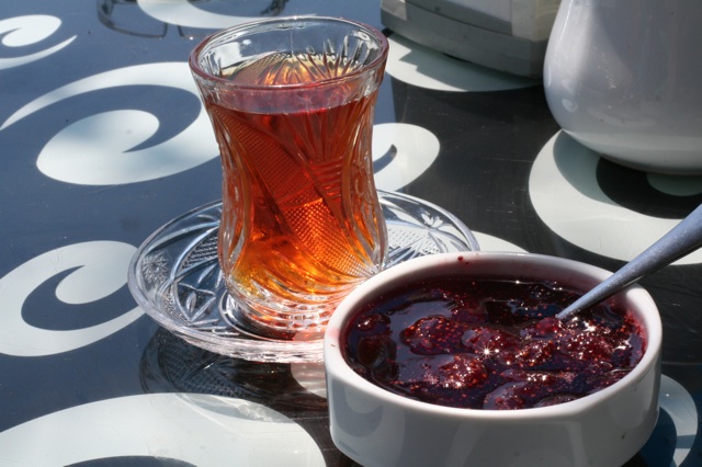 In Azerbaijan, they drink Azer Chay (literally Azeri Tea, but pronounced Azer Chai), and instead of serving it with milk and/or sugar, it comes with slices of lemon and a bowl of jam. Thus, when your tea has been poured, you had a slice of lemon and a spoonful or two of jam, which sweetens the tea. Their jam, though, isn’t like Smuckers or some other North American brand; it’s really more like a preserve, and the fruit is generally whole or in quarters, suspended in a thick, syrupy, liquid. It is delicious and very indulgent and I loved it.
